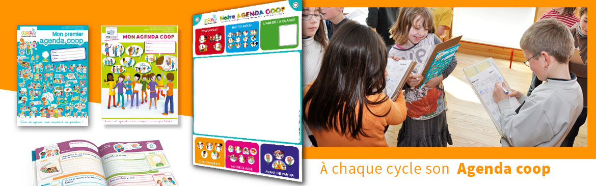 Les agendas coop' : des outils pédagogiques, illustrés, dans lesquels, chaque jour, les élèves découvrent une question et une activité pour apprendre à se connaître et s’estimer, aller vers les autres et mieux les respecter.